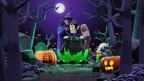 The animation shows a witch casting a spell, but Dracula PRANKS THEM AND POPS OUT to give everyone a fright. The environment is filled with fun spooky details like mummies, ghosts, pumpkins, spiders and bats.